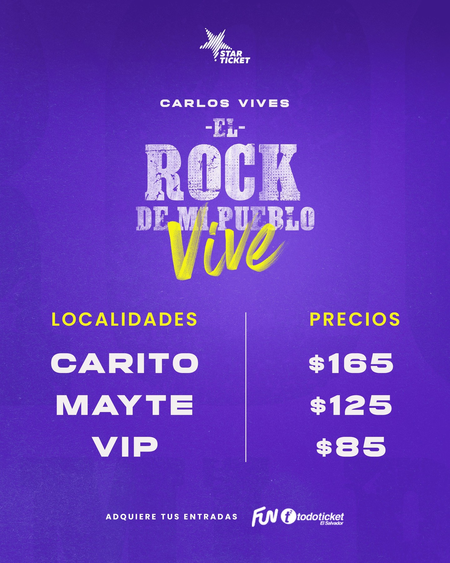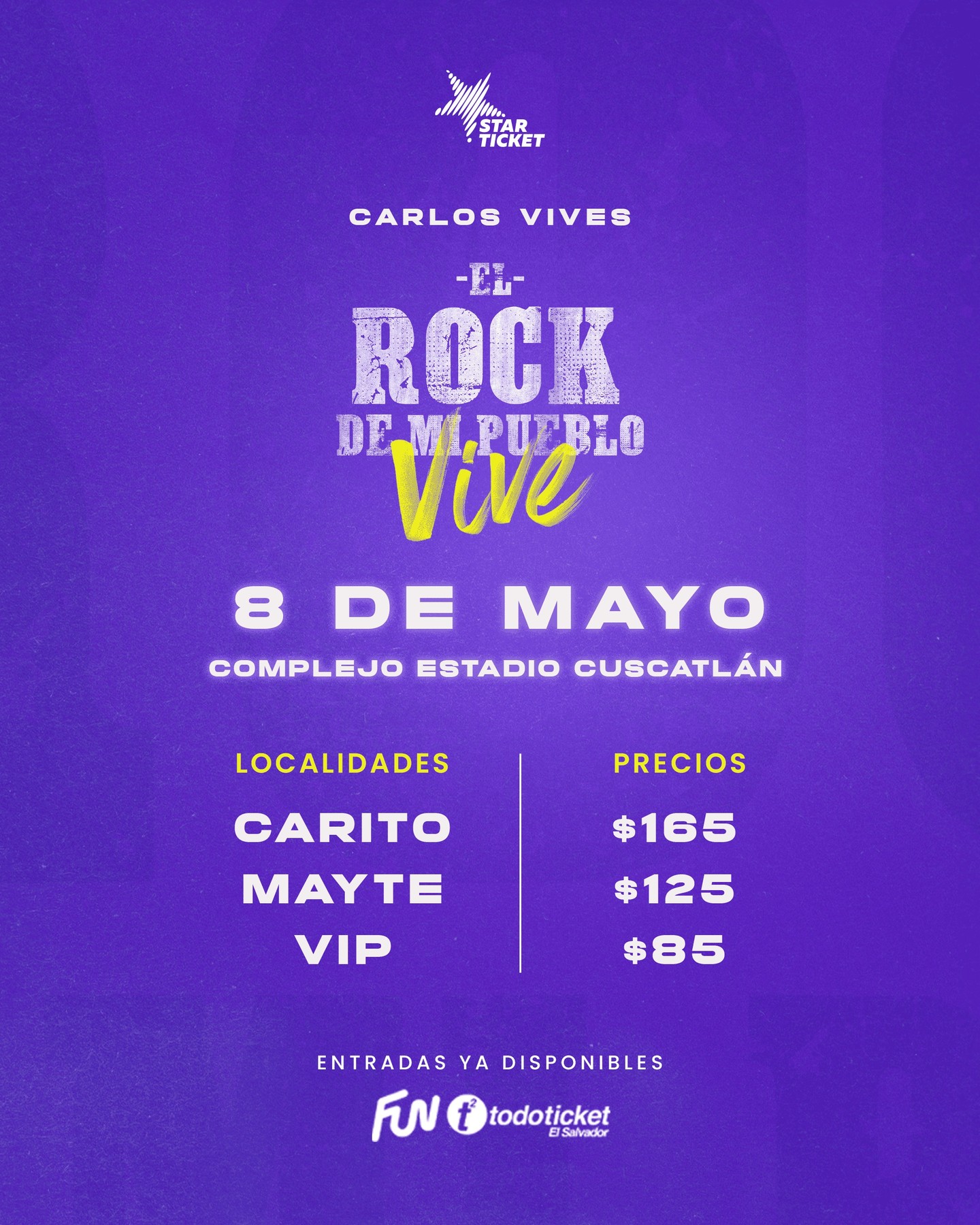 « Todos los Eventos Este evento ha pasado. Carlos Vives mayo 8, 2025 @ 8:00 pm - 11:30 pm « Megadeth Guns N’ Roses » LOCALIDADES UBICACIONES Comprar Añadir al calendario Google Calendar iCalendar Outlook 365 Outlook Live Detalles Fecha: mayo 8, 2025 Hora: 8:00 pm - 11:30 pm Web: https://carlosvives.funcapital.com/ Local Complejo Estadio Cuscatlán Calle antigua a Huizúcar, San Salvador San Salvador, San Salvador Organizador Star Ticket Ver la web Organizador