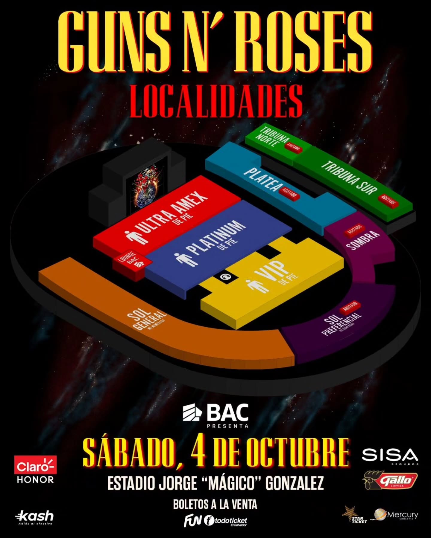 « Todos los Eventos Este evento ha pasado. Guns N’ Roses octubre 4, 2025 @ 8:00 pm - 11:30 pm « Carlos Vives Matute » LOCALIDADES UBICACIONES Comprar Añadir al calendario Google Calendar iCalendar Outlook 365 Outlook Live Detalles Fecha: octubre 4, 2025 Hora: 8:00 pm - 11:30 pm Web: https://gnr.funcapital.com/ Organizador Star Ticket Ver la web Organizador Local Estadio Nacional Jorge El Mágico González Estadio Jorge El Magico Gonzalez, 49 Av Sur, San Salvador San Salvador, San Salvador Teléfono: 23731616 Ver la web Local